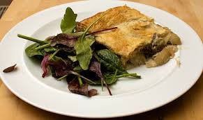 - Snijd het filodeeg in vierkantjes van ca. 9 à 12 cm, afhankelijk van het formaat van de vellen. Kwast deze aan één kant licht in met een beetje van de resterende olie, verfrommel ze iets en schik ze met de ingevette kant naar boven op de vulling. Bak de pie 25-30 min in de oven tot het deeg goudbruin en knapperig is.